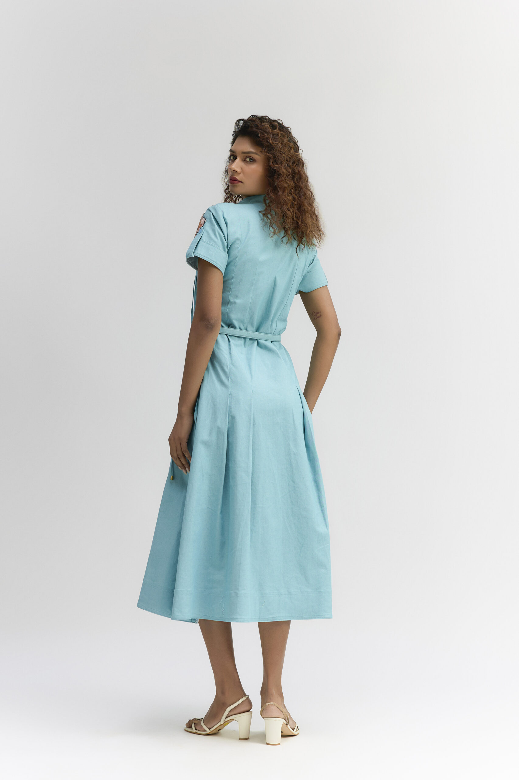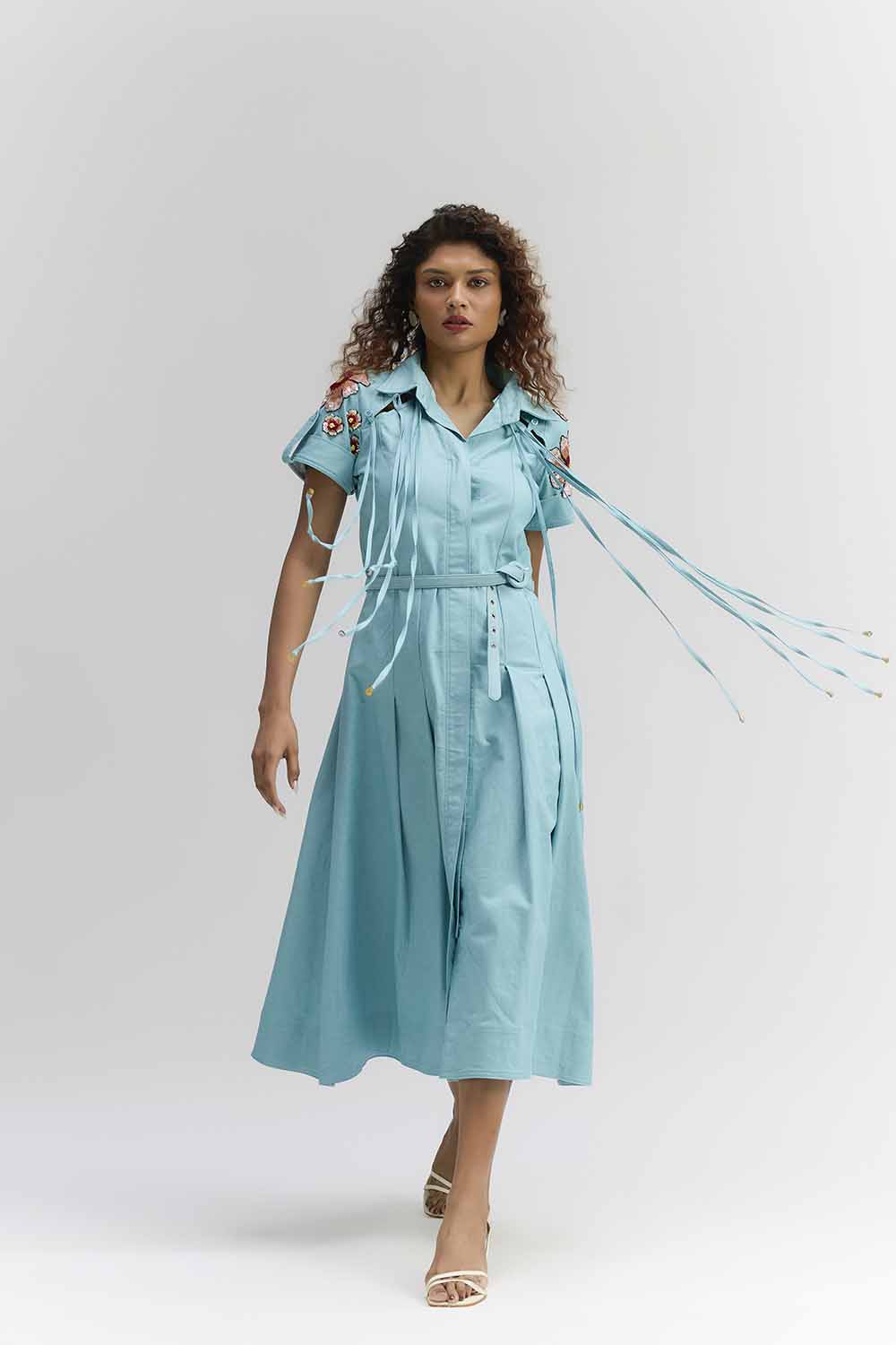 AQUA BLUE COTTON DENIM BUTTON-UP DRESS, FEATURING BEAD AND SEQUENCE EMBROIDERED FLOWER PATCHES ON SHOULDER, COMES ALONG WITH BUCKLE BELT FOR THAT COMPLETE LOOK. A PERFECT DRESS FOR FAMILY GATHERING, BRUNCH PARTY, TRAVEL.