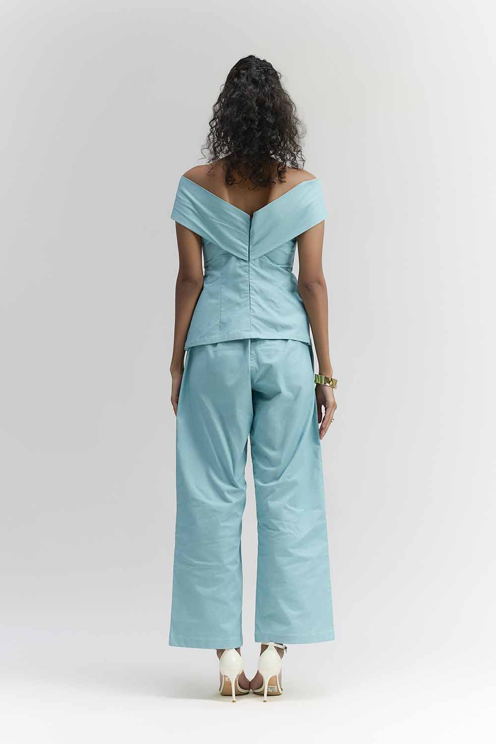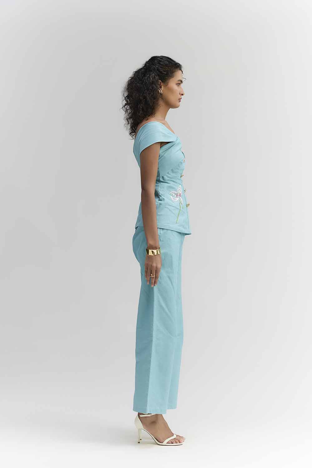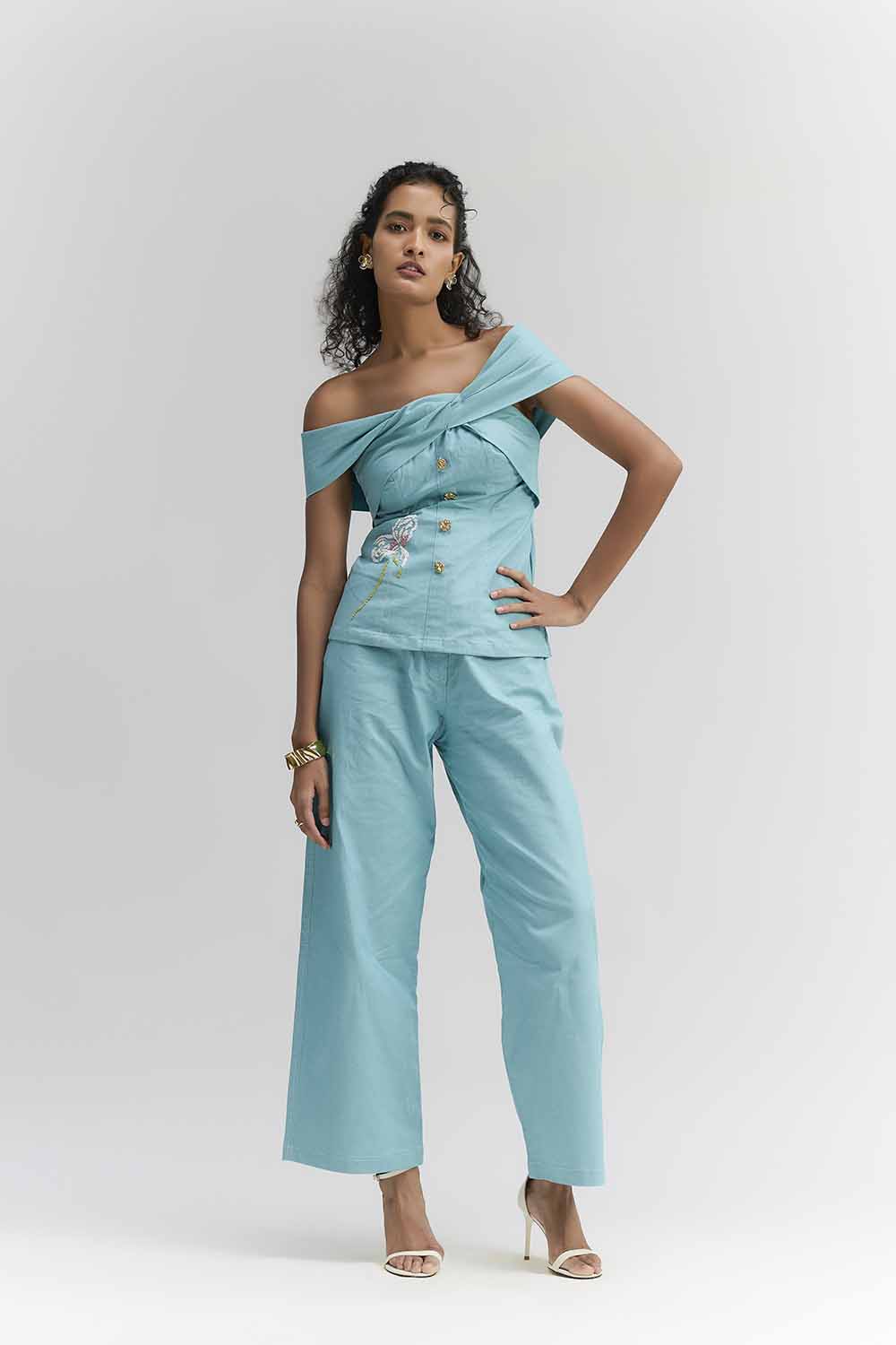 AQUA BLUE COTTON DENIM OFF-SHOULDER TOP, FEATURING BEAD EMBROIDERED FLOWER AND GOLD METALLIC BUTTONS, PERFECTLY PAIRED WITH STRAIGHT FIT PANTS. PERFECT OUTFIT FOR A BRUNCH PARTY, TRAVEL, COFFEE DATES.