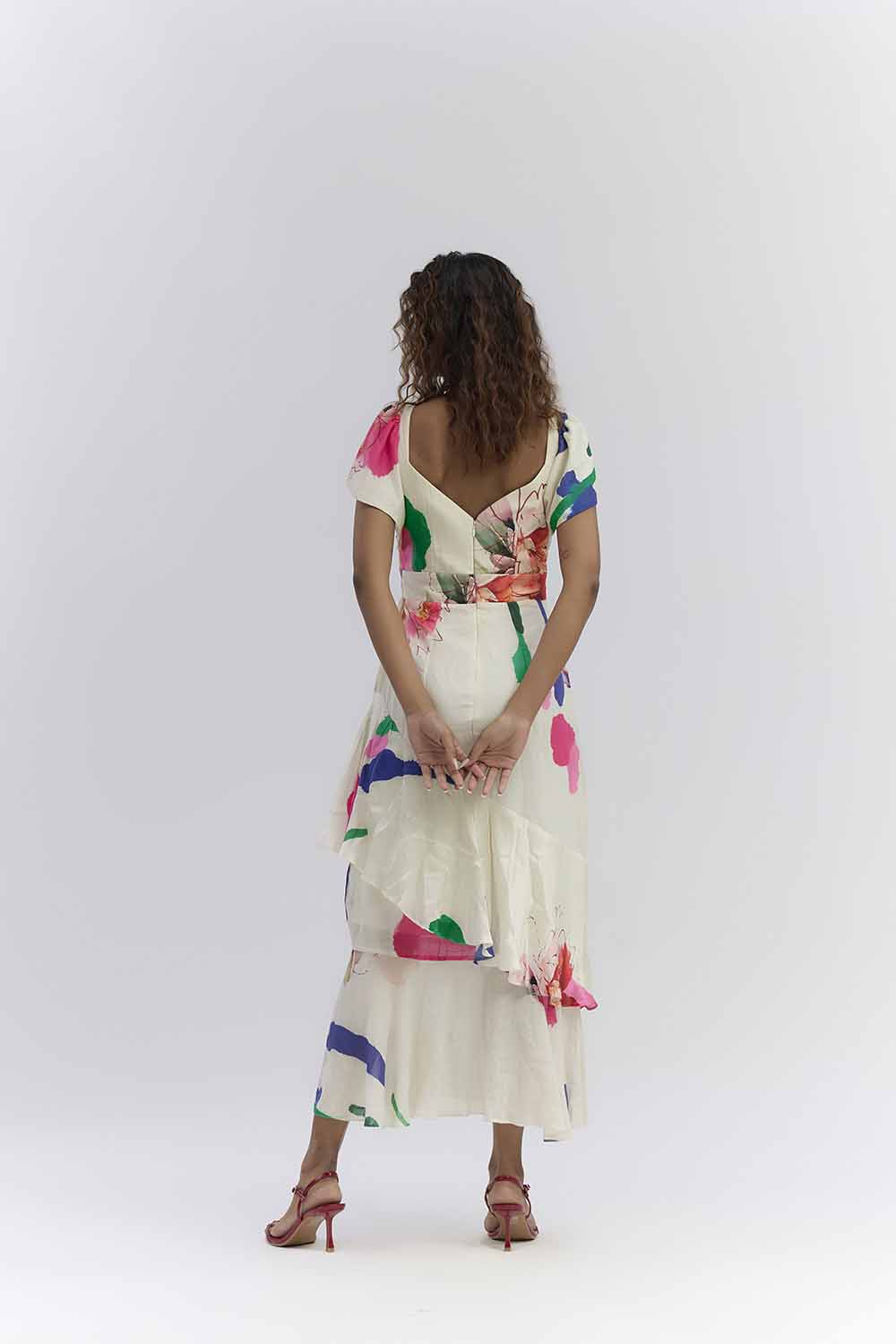MULTI COLOURED PRINTED SATIN SILK RUFFLED TOP FEATURING HAND EMBROIDERED FLOWERS , PAIRED WITH UNEVEN LENGTH SKIRT . COMPONENTS: TOP +SKIRT OCCASION : PARTY , LAUNCH EVENT , FAMILY GATHERING SLEEVE STLE : RUFFLE DETAIL ON SLEEVE FIT : RELAXED FIT