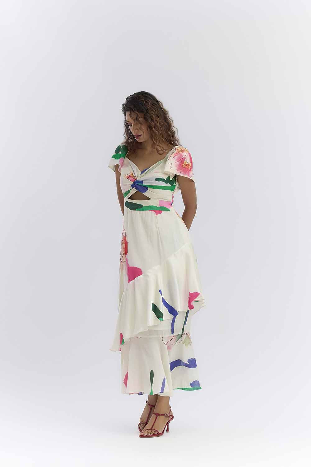 RUFFLED SLEEVES WITH SMALL FLORAL PATCHES AND UNEVEN SKIRT
