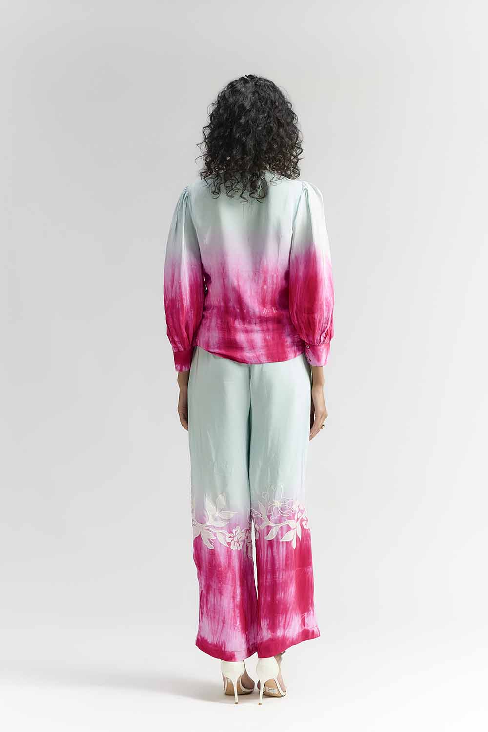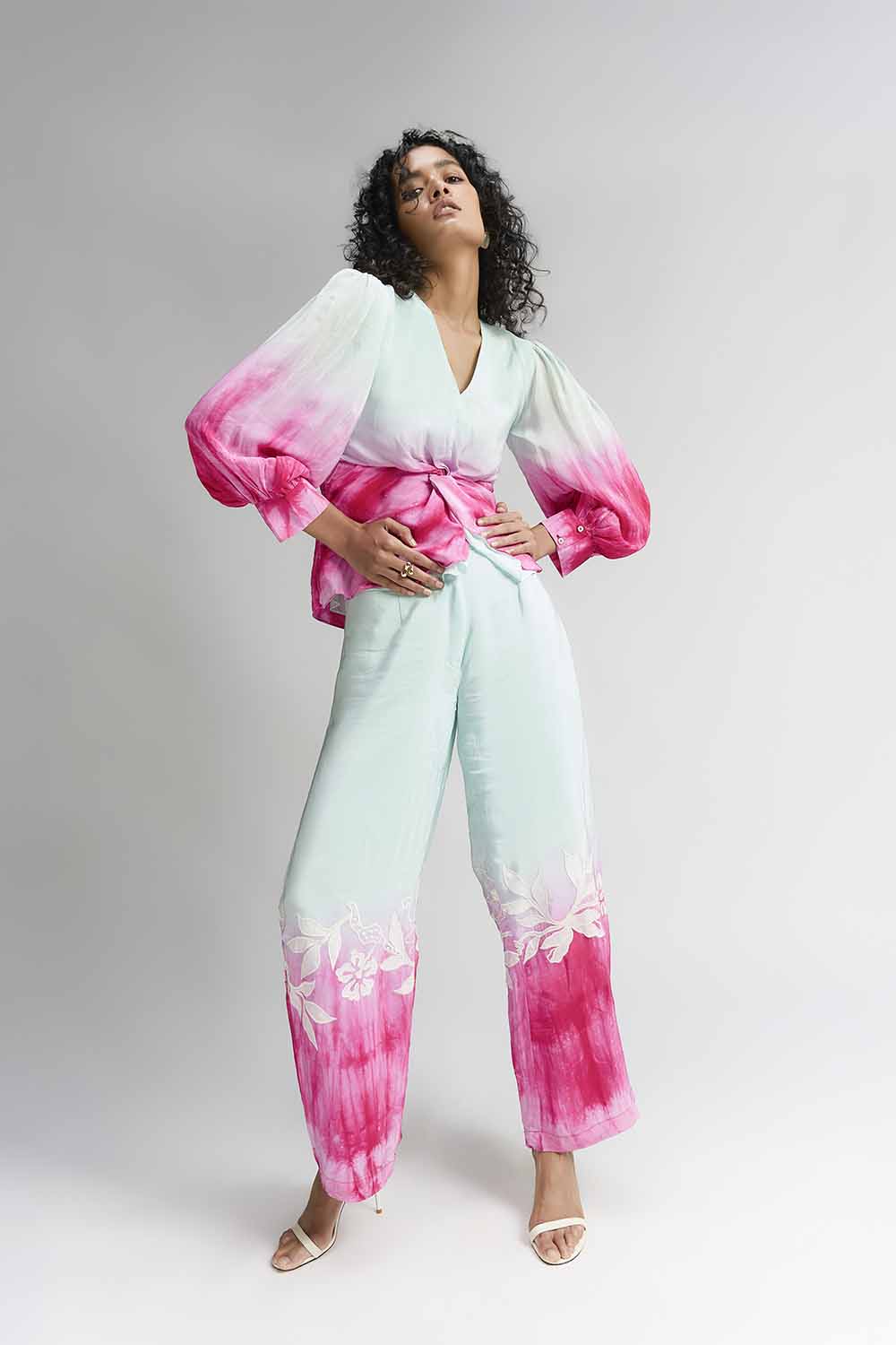 MINT PINK PLEATED OMBRE FRONT KNOT TOP WITH PUFF SLEEVES IN SILK CREPE BASE, PAIRED WITH STRAIGHT FIT PANTS WITH FLORAL MOTIF APPLIQUE WORK OVER THE HEM. ACCENTUATE IT WITH STUD EARRINGS AND HEELS FOR A COMPLETE LOOK.