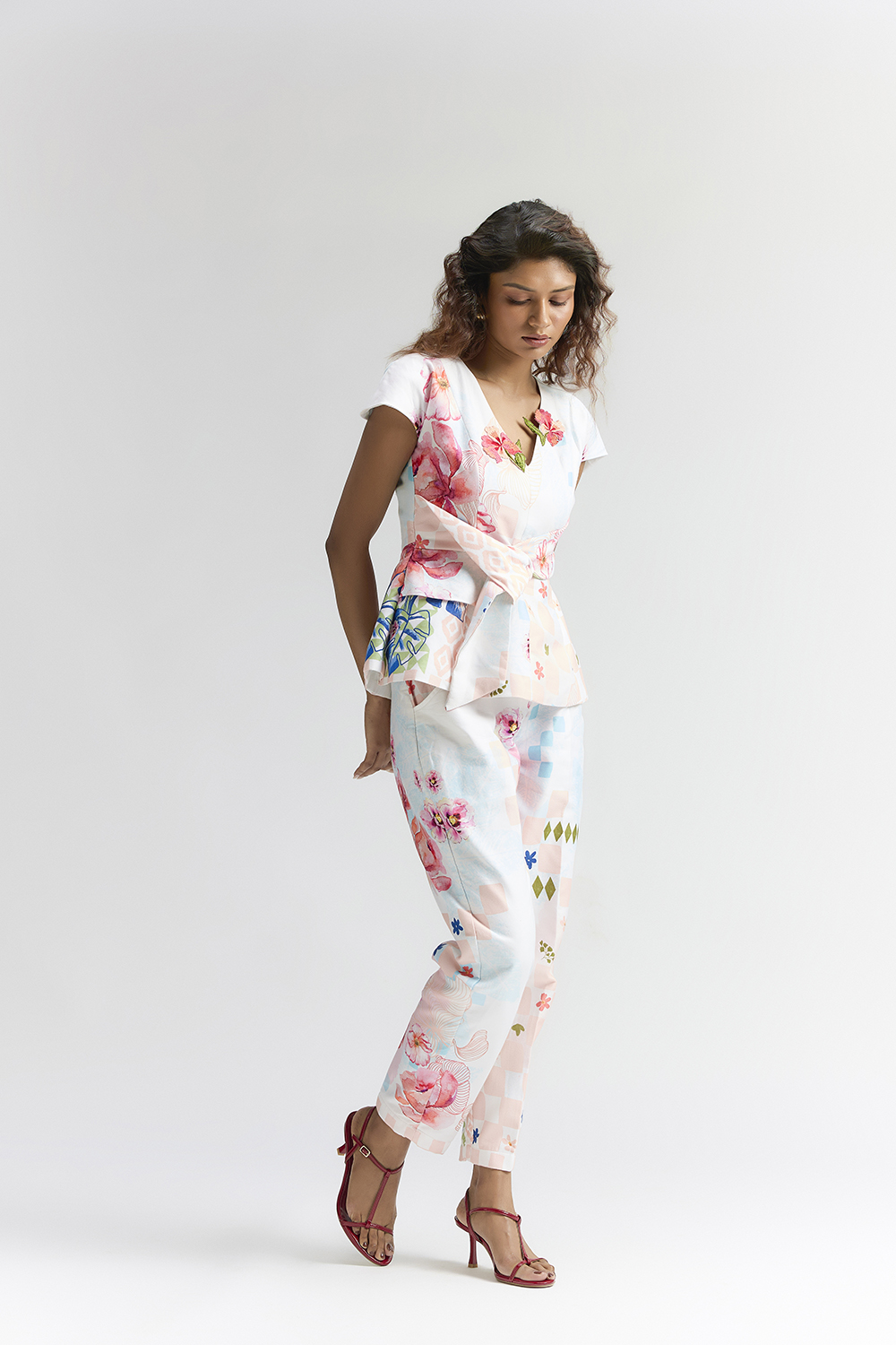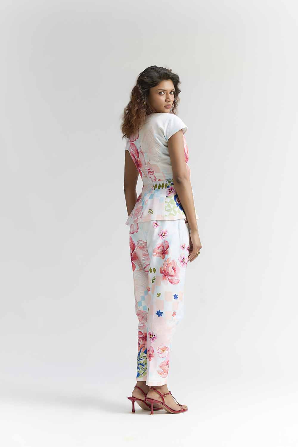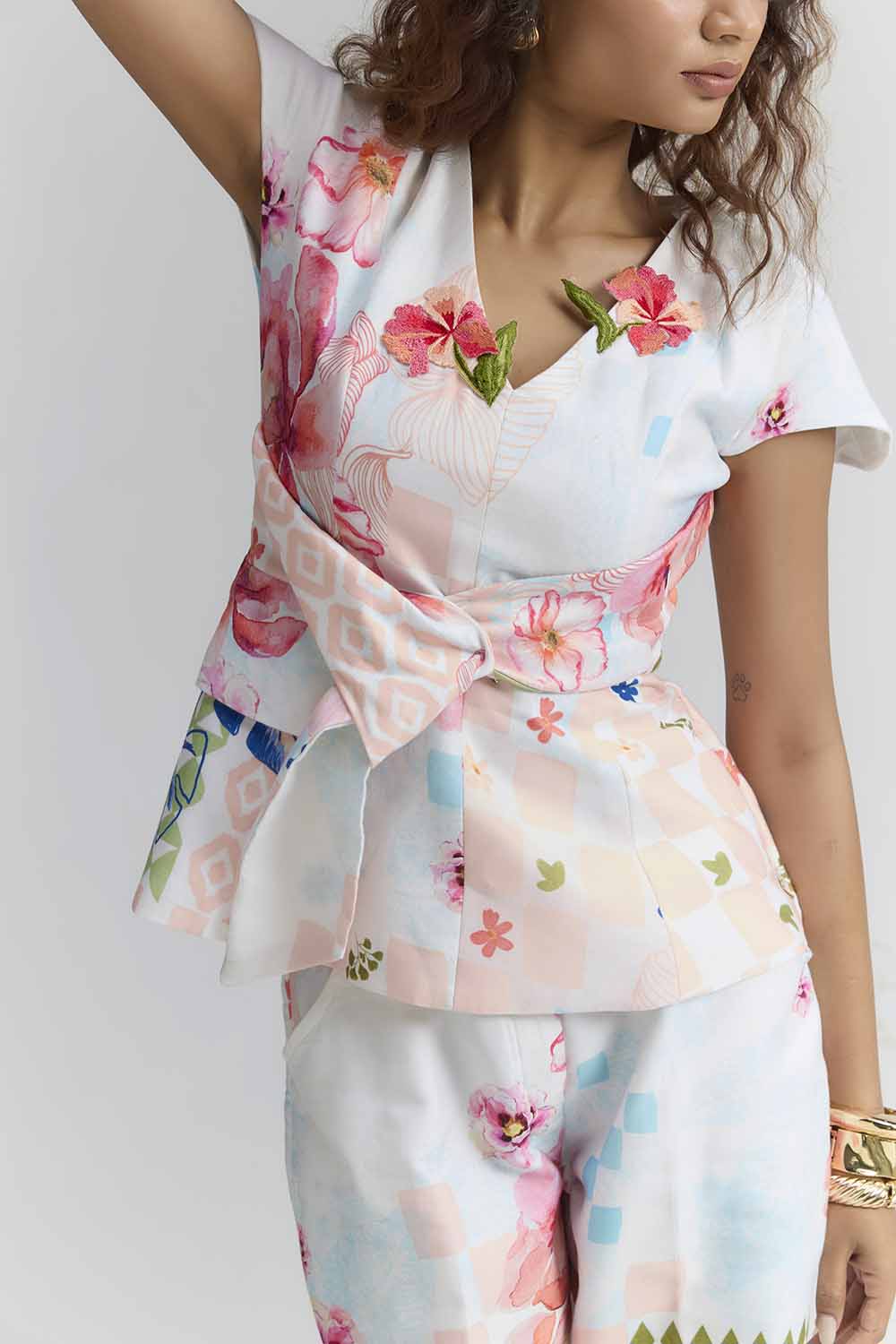 A MULTI COLOURED COTTON SATIN ABSTRACT FLORAL PRINTED PEPLUM TOP , FEATURING WAIST TIE UP AND & FLORAL PATCHES NEAR NECKLINE, PAIRED WITH PANTS . , PERFECT PANTS FOR UR NEXT TRIP . COMPONENTS:TOP & PANT OCCASION : LAUNCH EVENT , BRUNCH PARTY FIT : FITTED AT BUST AND WAIST