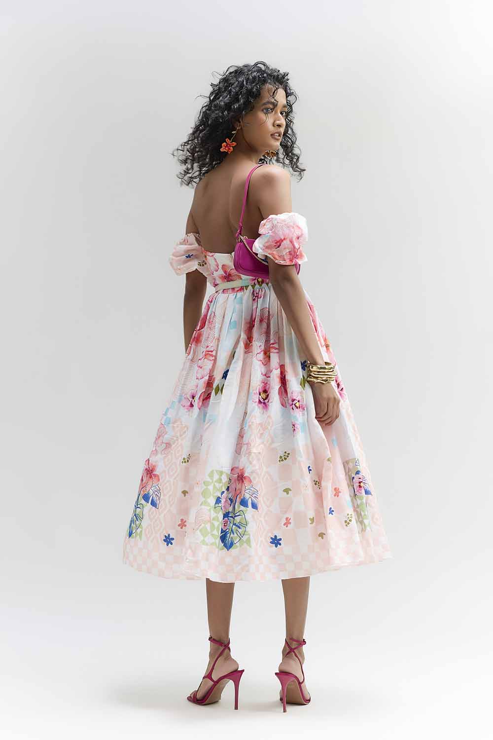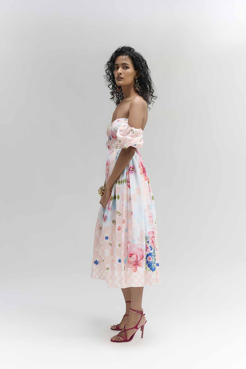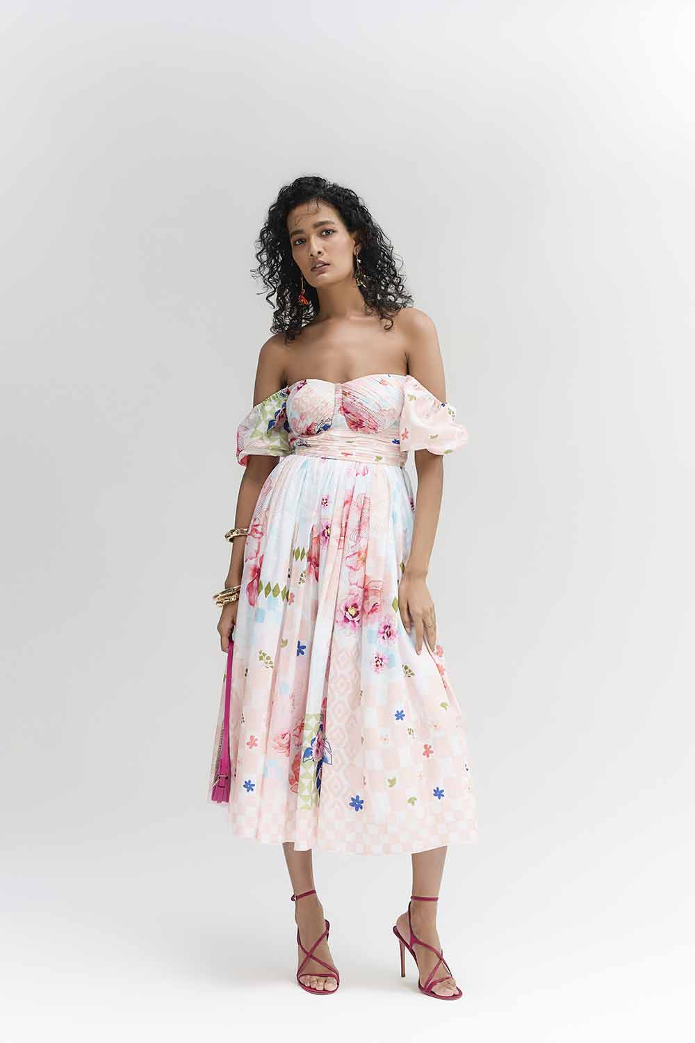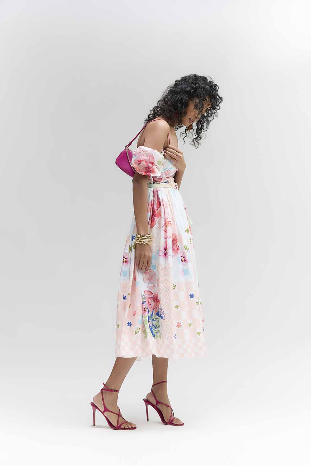 A MULTI COLOUR ABSTRACT FLORAL PRINTED ROSE LYLA MIDI DRESS MADE IN COTTON SATIN FABRIC FOR COMFORT AND FALL , FEATURING RUSHING DETAILS ON BUST , BELT TO HIGH LIGHT WAIST AND DREAM FLARE TO ENJOY EACH MOMENT . COMPONENTS:DRESS & BELT OCCASION : LAUNCH EVENT , BRUNCH PARTY , TRAVEL , BABY SHOWER FIT : FITTED AT BUST