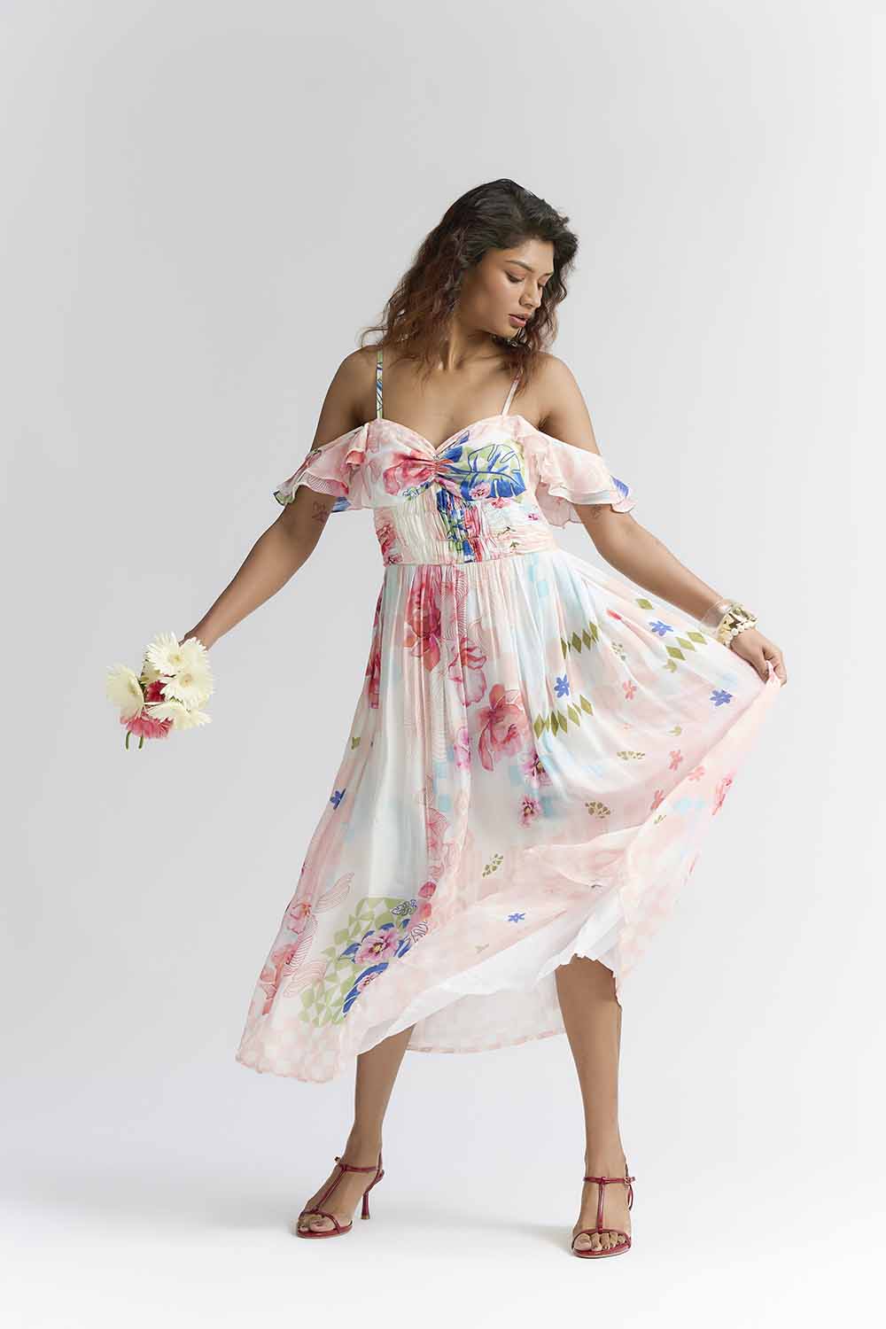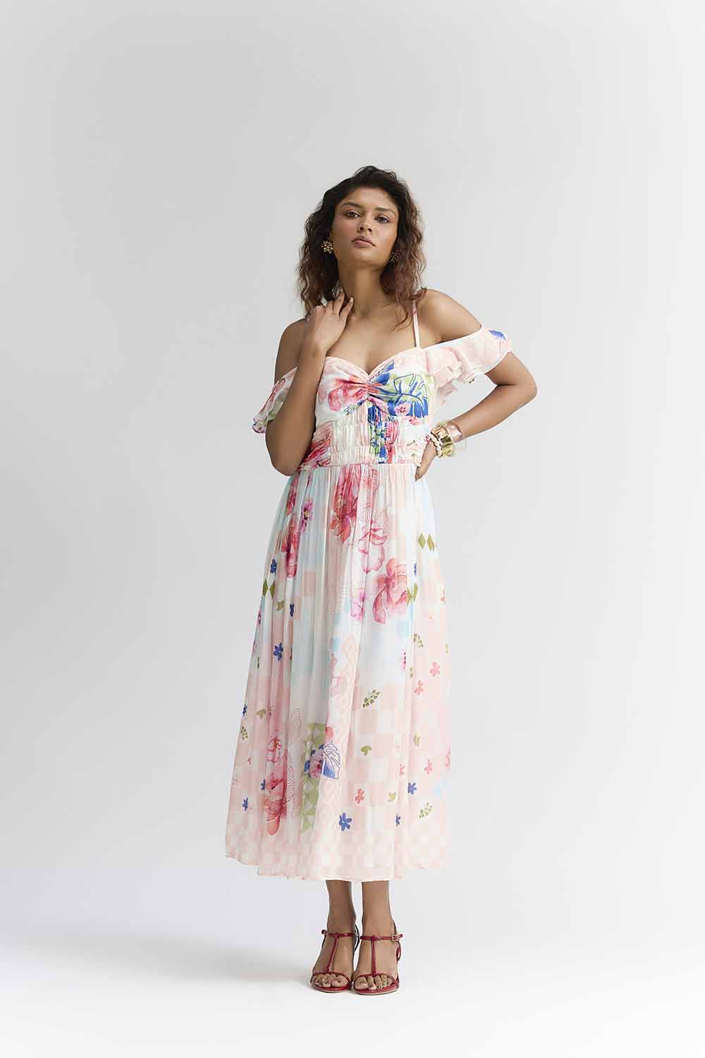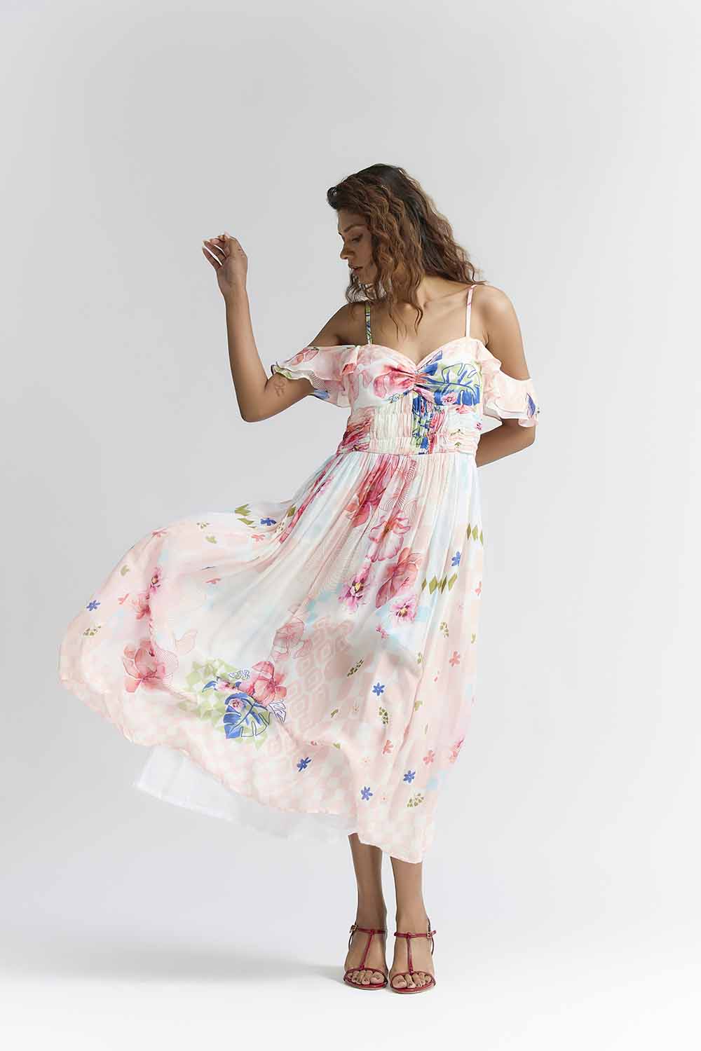 Featuring Multi coloured Midi dress in silk base with abstract floral print , sweat heart neckline , Rushing detail on bust , sofft ruffled sleeves .Accentuate it with loop earrings , block heels for beach dates , brunches or vacation wear . components : Dress Occasion : Beach , brunch dates , Vacation Fit : fitted at bust