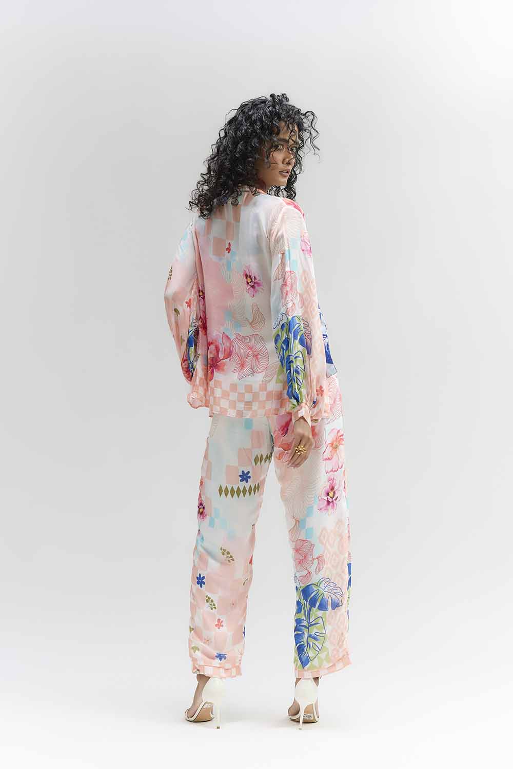 PRESENTING A MULTI COLOURED SILK ABSTRACT GEOMETRIC & FLORAL PRINTED SHIRT TIE UP ON NECK AND SOFT PUFF SLEEVES , CAN BE PAIRED WITH SHORTS OR HIGH WAIT PANTS , A PERFECT SHIRT FOR BRUNCH . COMPONENTS: SHIRT OCCASION : BRUNCH , TRAVEL SLEEVE STLE : SOFT PUFF SLEVEES FIT : RELAXED FIT