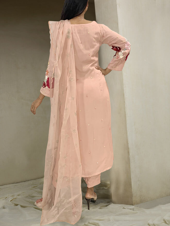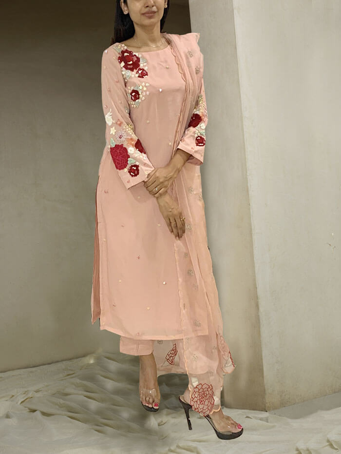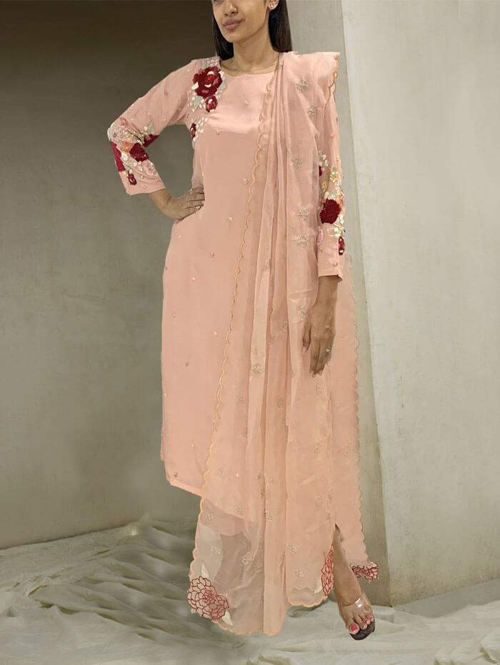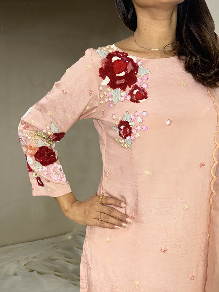 The Fun and Romantic embroidered Tunic set have so much to offer. This peachy rose embroidered tunic set, Beautified with floral Applique and sequence embroidery, comes along with embroidered organza dupatta. this trendy set is going to win hearts no matter where you go.