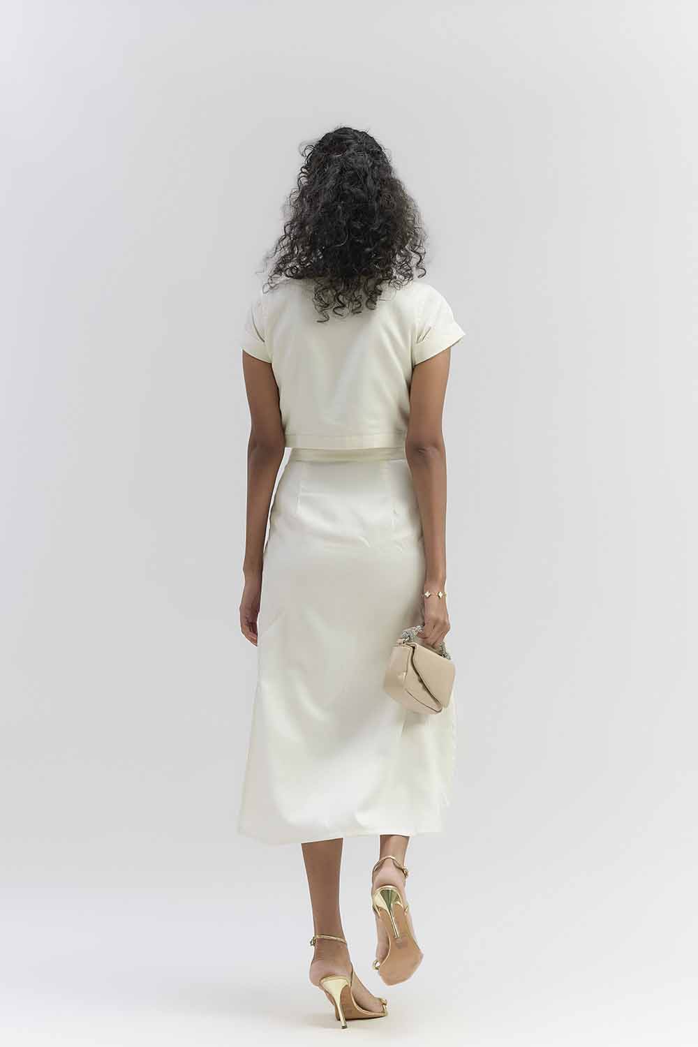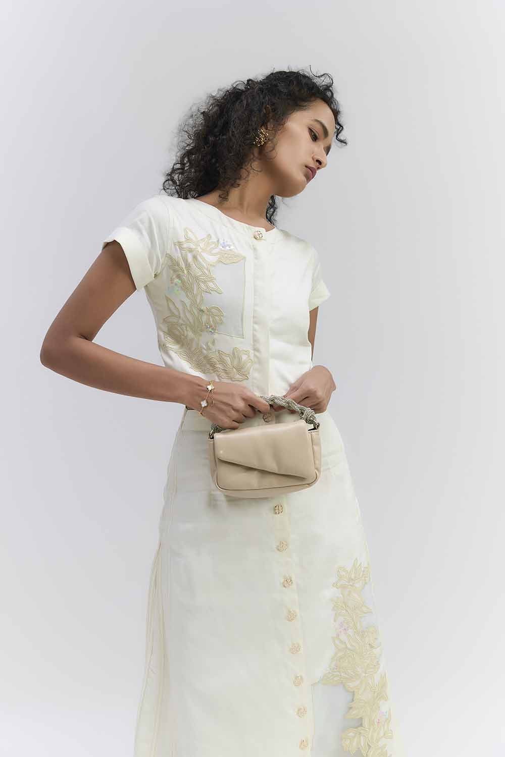 Pearl white Twill crop top featuring intricate Applique & bead work , paired with straight fit elegant skirt with intricate Applique . Cpmponents : Top & Skirt , Occasion : Semi formal event , family fathering , launch event . Fit : relaxed fix .